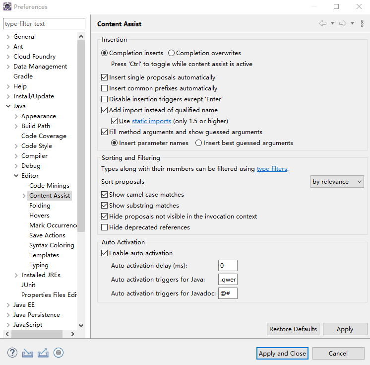 依次进入Window -> preferences -> java -> Editor -> Content Assist