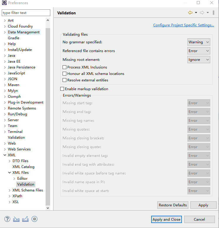 依次进入Window -> preferences -> XML -> XML Files -> Validation 取消勾选:Honour all XML schema locations,这告诉eclipse,不再验证不同schema位置的相同命名空间的引用,仅以第一次找到的可验证的XML文件为结果。Apple若有弹窗选择是即可。