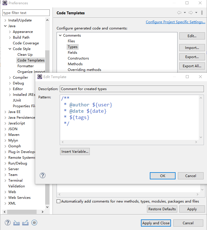 依次进入 Window -> preferences  -> Java  -> CodeStyle  -> Code Templates -> types 设置模板 user是电脑账号名,也可自定义,时间格式${date}固定不可改变。