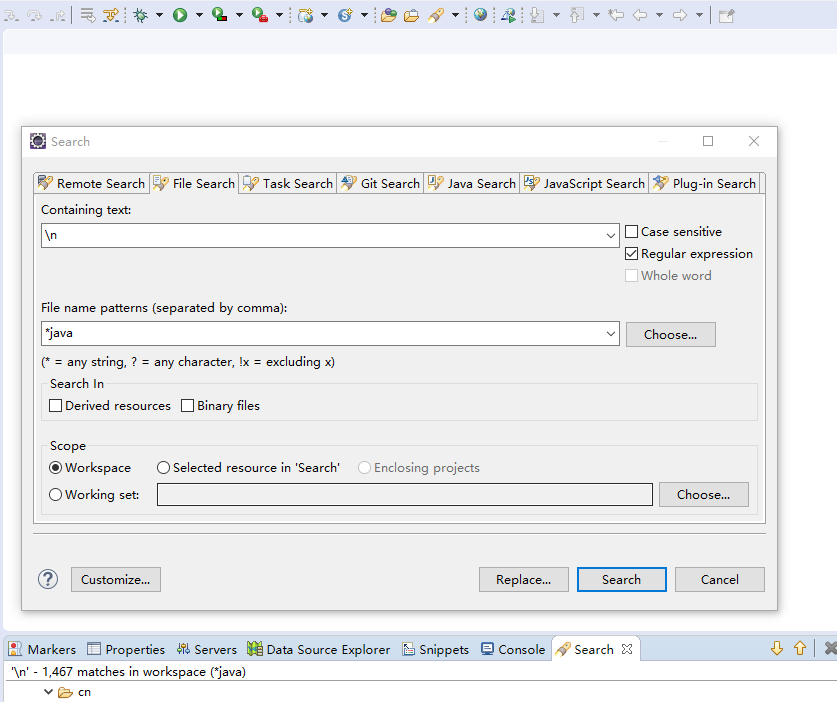 依次进入 Search -> file Containing tex 输入 \n,勾选 Regular expression ,File name patterns 输入*java,当然也可以输入*css,*html( 点击choose切换 )等文件后缀,这里匹配的是你所要统计的文件。点击 Search 后,下方便有代码总数了。这是统计的工作区的所有项目,当然也可统计单个项目。