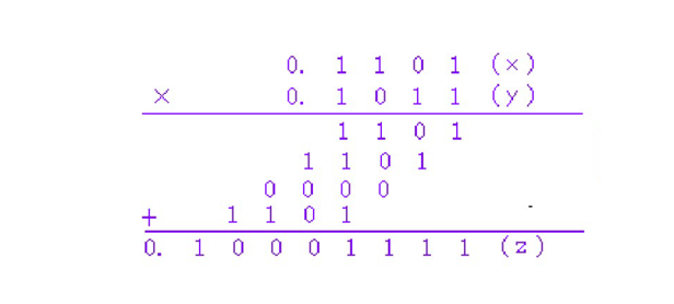 运算过程与十进制乘法相似:从乘数y的最低位开始,若这一位为“1”,则将被乘数x写下;若这一位为“0”,则写下全0。然后再对乘数y的高一位进行乘法运算,其规则同上一步,不过这一位乘数的权与最低位乘数的权不一样,因此被乘数x要左移一位。以此类推,直到乘数各位乘完为止,最后把它们统统加起来,便得到最后乘积。