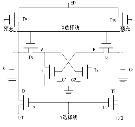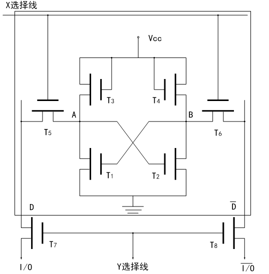 X 选择线用来选择整个一行的存储元,Y 选择线通过公用的T7、T8 管选择整个一列的存储元。只有位于一条X 选择线和一条Y 选择线交叉点上的存储元被选中,才可以对它进行读/写操作。