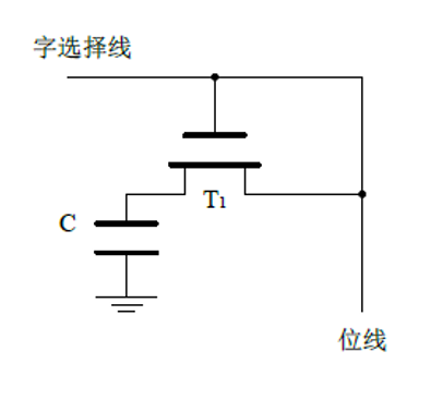 写入操作:字选择线为“1”使T1 管导通,要写“1”,在位线(数据线)上加高电位,经T1管对C充电;写“0”则在数据线上加低电位,使C上无电荷。