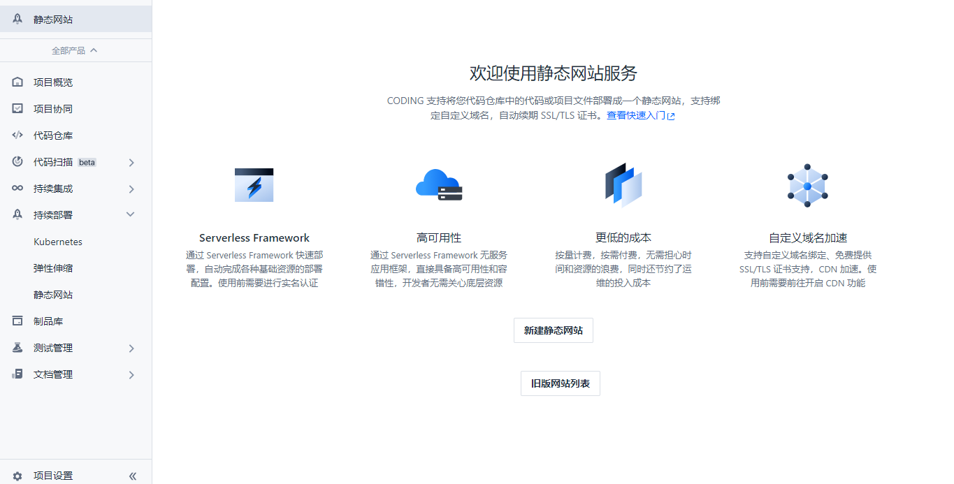 进入coding找到部署的项目(不得不说新改版的看着有点别扭),进入到持续部署的静态网站,这里不用新建,因为我们之前已经部署过了,点击旧版网站列表进入到以前部署的项目。进入后直接到设置下拉到自定义域名,点击申请证书(注意这里需要DNS停掉GitHub Pages 的解析)。直至证书状态变为正常即可。
