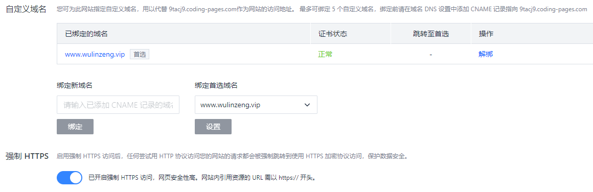 绑定域名成功后,系统将会自动为其申请 SSL/TLS 安全证书。( SSL/TLS 安全证书到期前一周,系统将自动续签。)