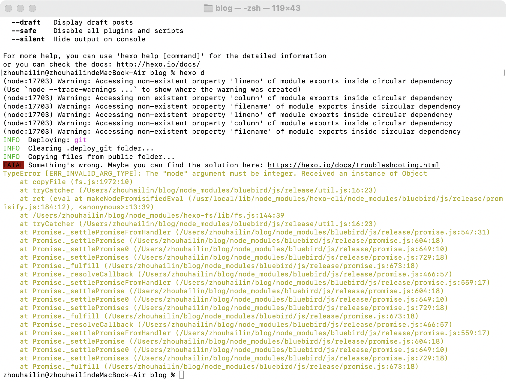 fatal something's wrong. maybe you can find the solution here: https://hexo.io/docs/troubleshooting.html typeerror [err_invalid_arg_type]: the "mode" argument must be integer. received an instance of object